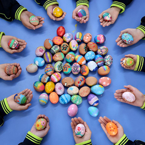 3月20日,在浙江省金华市婺城区红湖路小学,学生体验立蛋民俗。