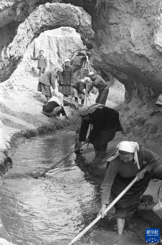 1963年,新疆吐鲁番群众在整修坎儿井渠道。