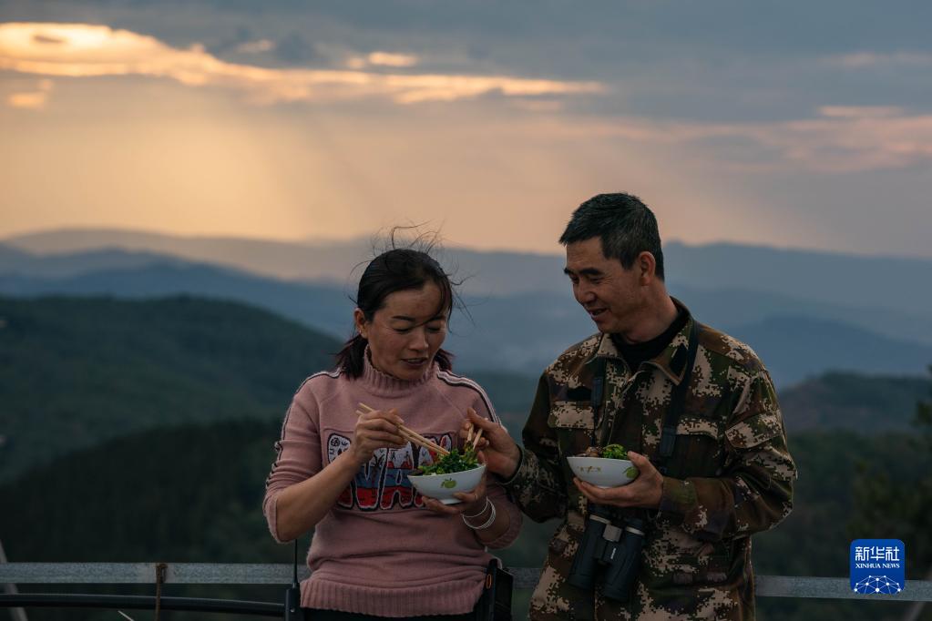 护林员陈华(右)在昆明海口林场瞭望台和妻子吃晚饭(3月20日摄)。