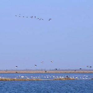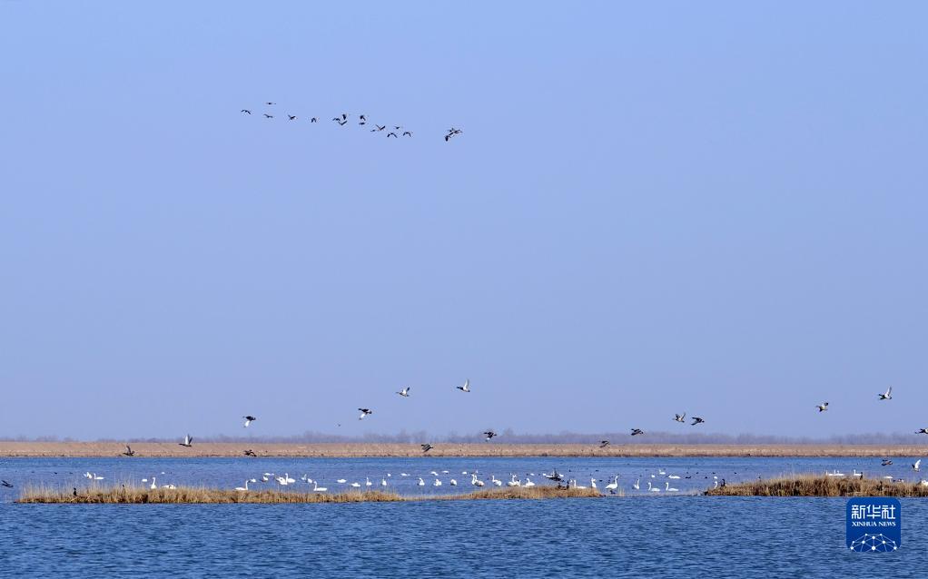 眼下,气温回升,成群候鸟由南而来飞抵黄河北端。