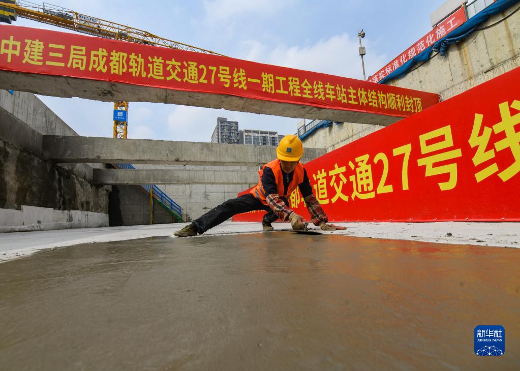 3月21日,在成都地铁27号线金府站,中建三局的施工人员在进行混凝土抹平作业。