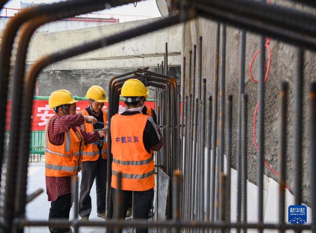3月21日,在成都地铁27号线金府站,中建三局的施工人员在绑扎钢筋。