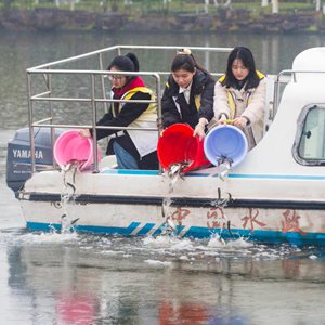 3月21日,在浙江省宁波市北仑区东泰河,志愿者将鱼苗放流入河。