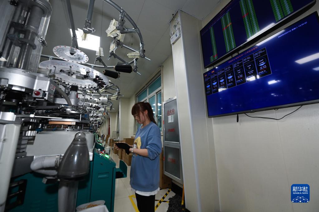 3月21日,在诸暨安华镇的涧澜袜业有限公司数字化车间内,全自动袜机在生产袜子,所有生产数据都显示在系统大屏幕上。