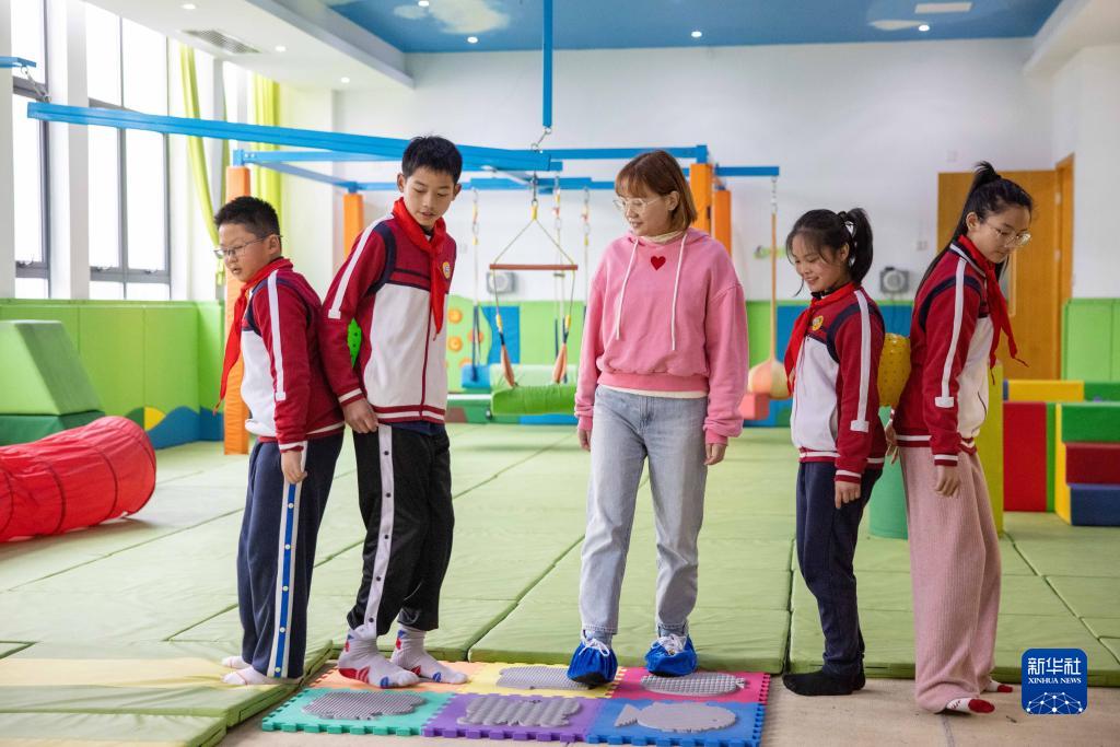 3月22日,宁波市江北区洪塘实验学校的心理教师在感统训练教室对学生进行游戏式心理辅导。