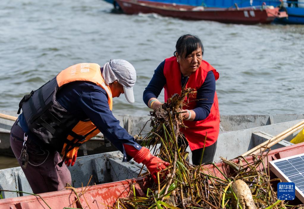 3月20日,李云丽(右)将打捞的枯枝落叶等交给工作人员处理。