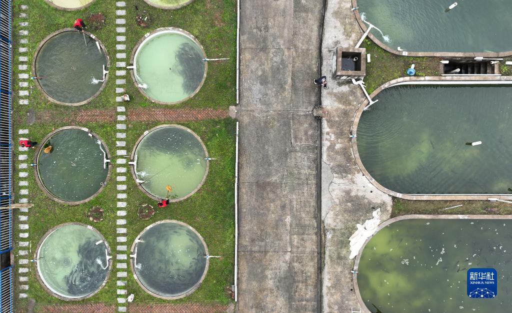 3月22日,衡山县岭坡乡灯山村泉水鱼养殖基地工作人员在捕鱼(无人机照片)。