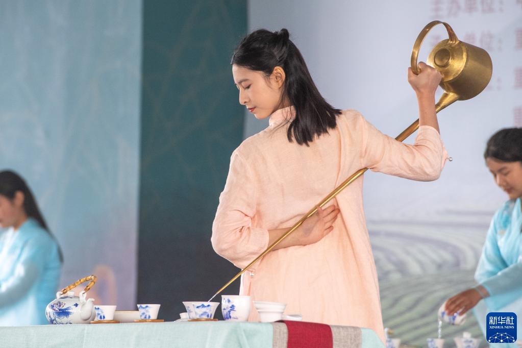 3月22日,在重庆市永川区永荣镇乡村振兴就业园,演艺人员在表演茶艺。