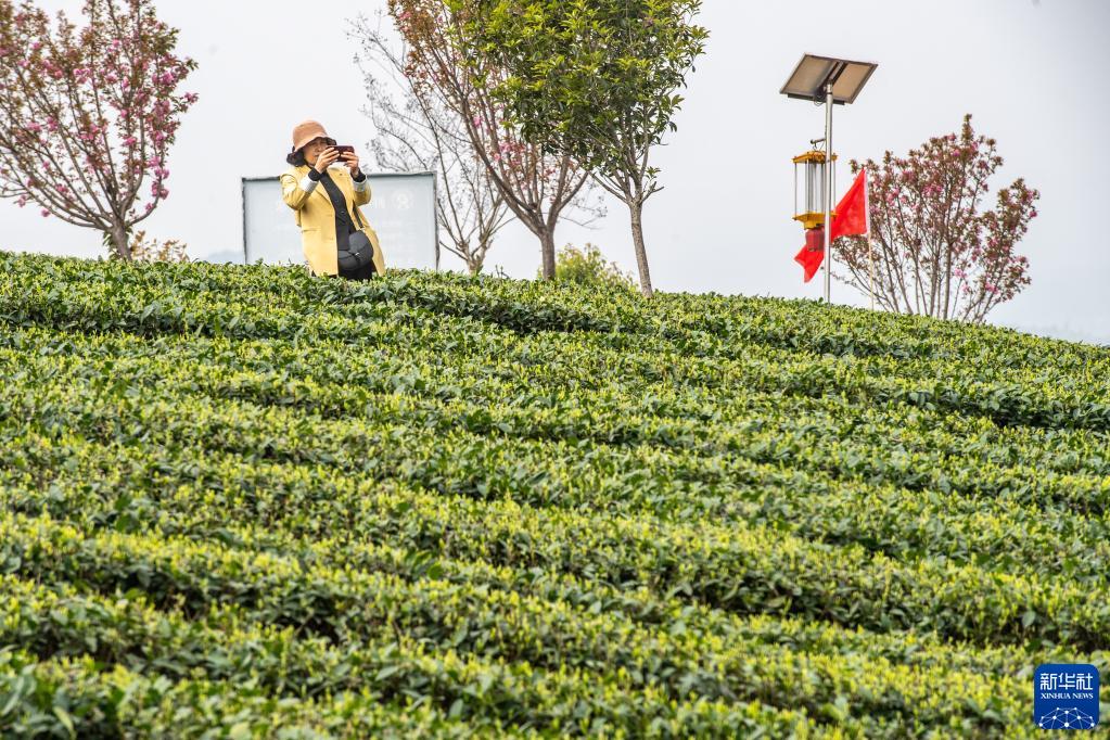 3月22日,在重庆市永川区永荣镇乡村振兴就业园,游客在茶园内参观游玩。