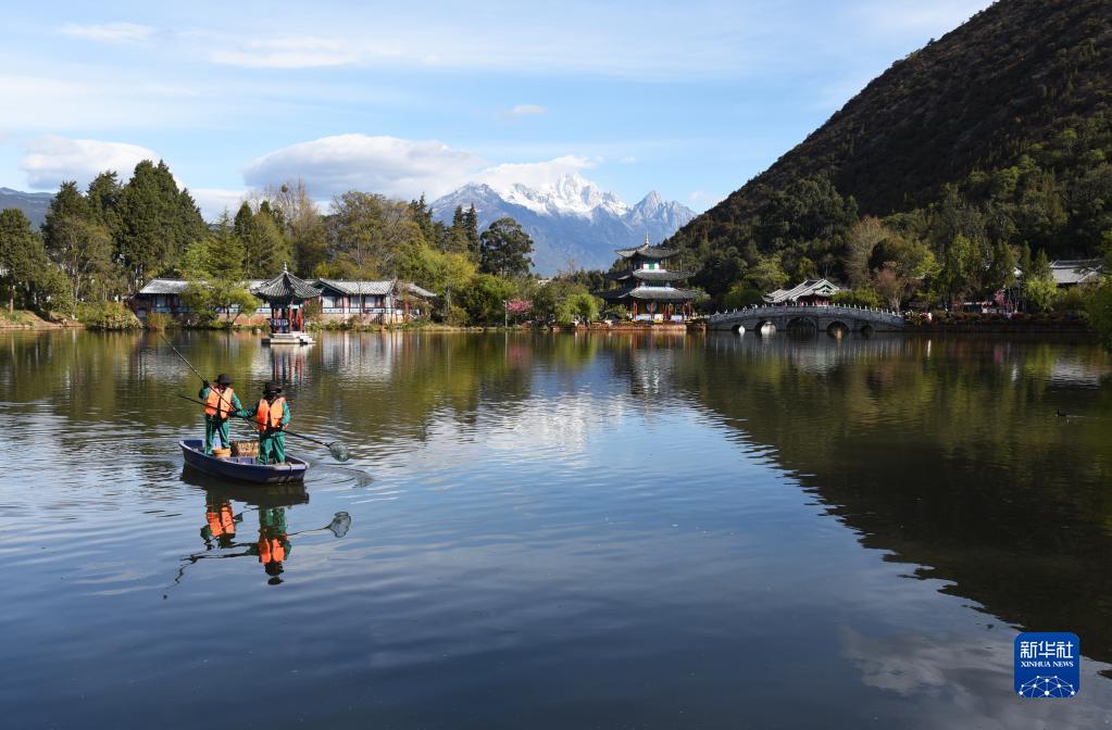 3月22日,在云南省丽江市古城区黑龙潭公园,环卫工人在打捞水面垃圾。