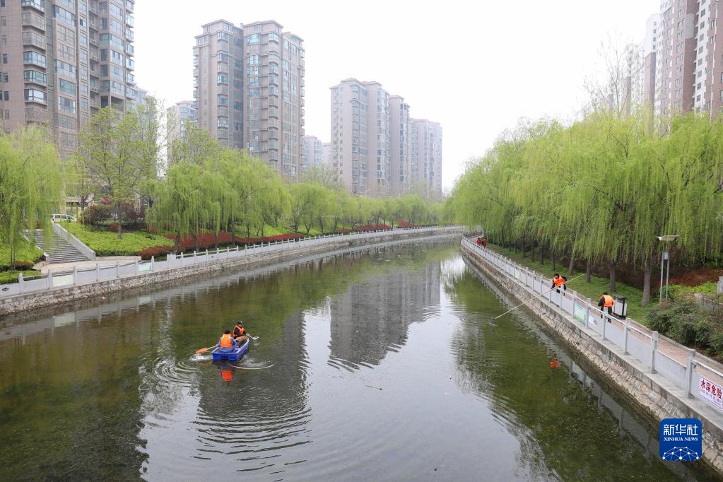 3月22日,在河南省平顶山市宝丰县玉带河,工作人员在清理河面上的漂浮物。