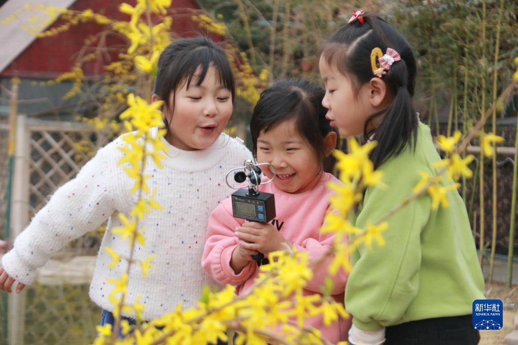 3月22日,在山东省高密市密水街道中心幼儿园,小朋友在体验使用轻风表。