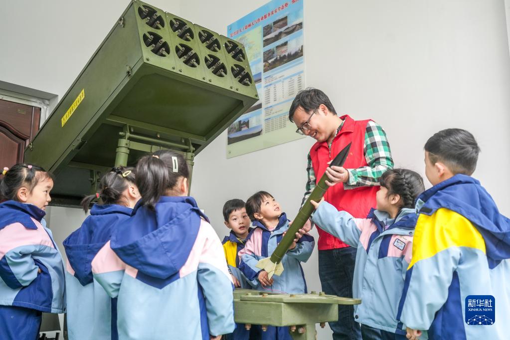 3月22日,在浙江省湖州市长兴国家气象观测站,龙山街道中心幼儿园的孩子在了解人工增雨设备。