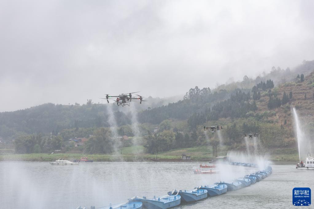 3月23日,在重庆市铜梁区高楼镇涪江流域突发水污染事件应急联合演练现场,工作人员运用无人机、水上雾炮船等设备模拟向江面抛洒重金属捕捉剂。