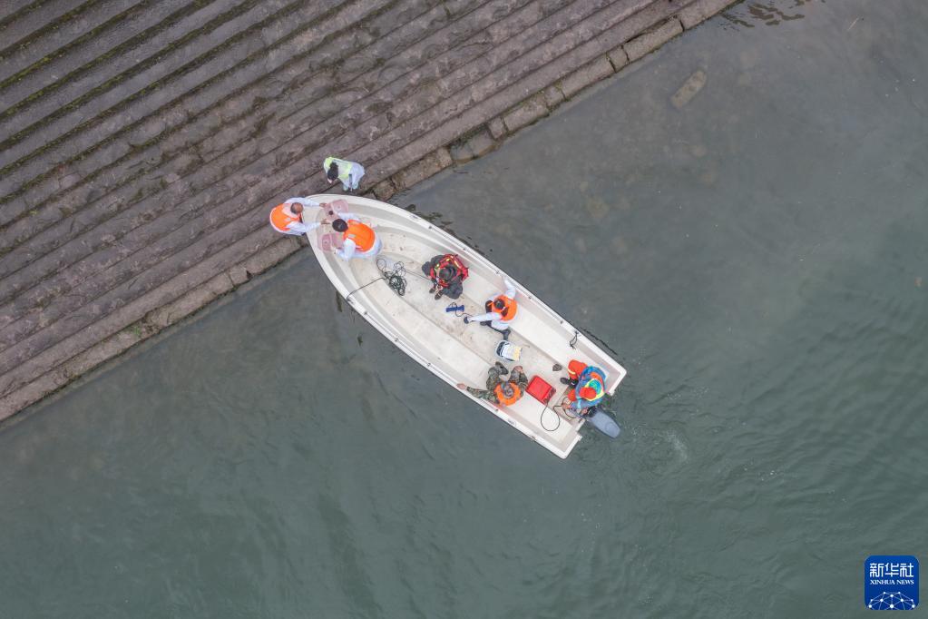 3月23日,在重庆市铜梁区高楼镇涪江流域突发水污染事件应急联合演练现场,环境监测人员将取到的江水样品递给岸边工作人员(无人机照片)。