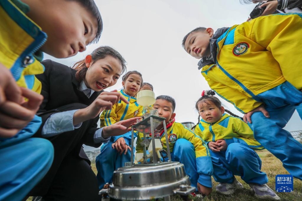 3月23日,工作人员在贵州省铜仁市玉屏侗族自治县气象局为小朋友介绍气象知识。