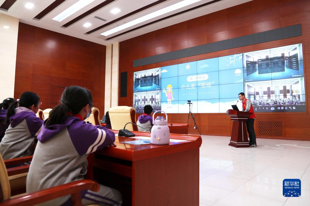 3月23日,工作人员在内蒙古自治区气象台为学生讲解气象知识。