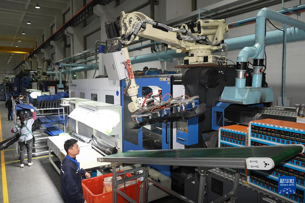 在位于台州市的浙江博弈科技股份有限公司自动化生产线上,工业机器人和人工合作生产汽车部件(3月21日摄)。该公司是国内汽车轻量化塑料零部件行业龙头企业,专注于高端汽车零部件生产。