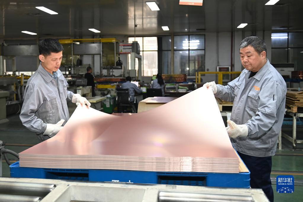 工人在位于杭州市的浙江华正新材料股份有限公司覆铜板生产车间作业(3月23日摄)。