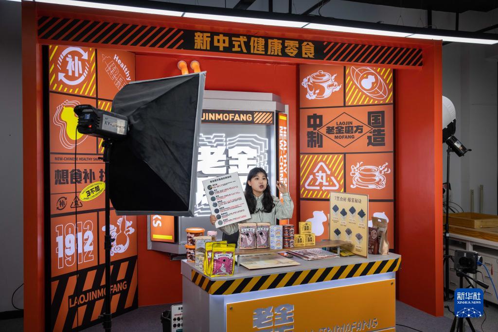 在位于杭州市的浙江仁之初健康产业有限公司直播间内,主播在推介零食产品(3月23日摄)。