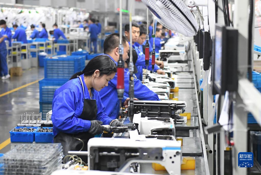 在位于台州市的杰克科技股份有限公司,工作人员在装配车间装配缝纫机(3月23日摄)。该公司作为全球缝制设备行业产销规模最大的企业之一,开年以来订单保持增长势头。