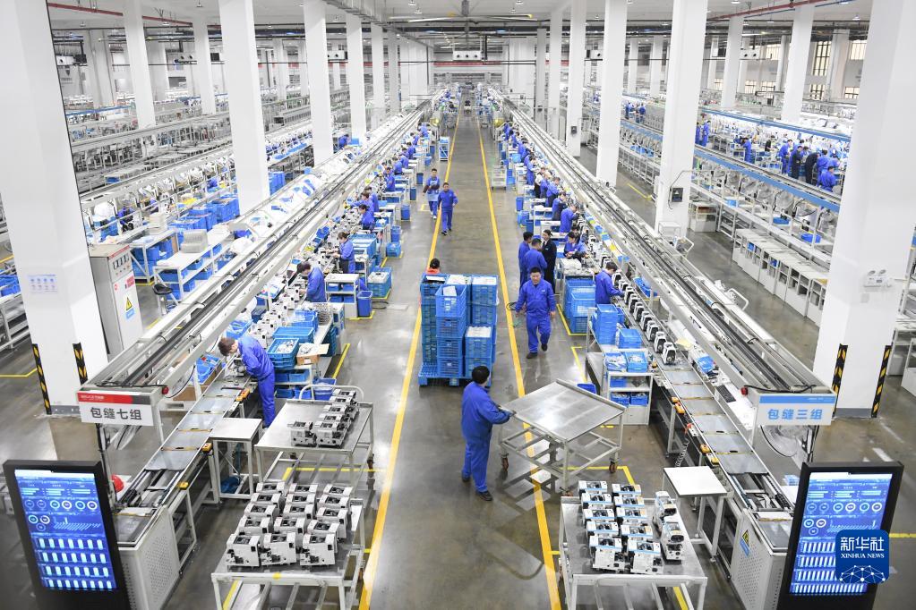 在位于台州市的杰克科技股份有限公司,工作人员在装配车间装配缝纫机(3月23日摄)。