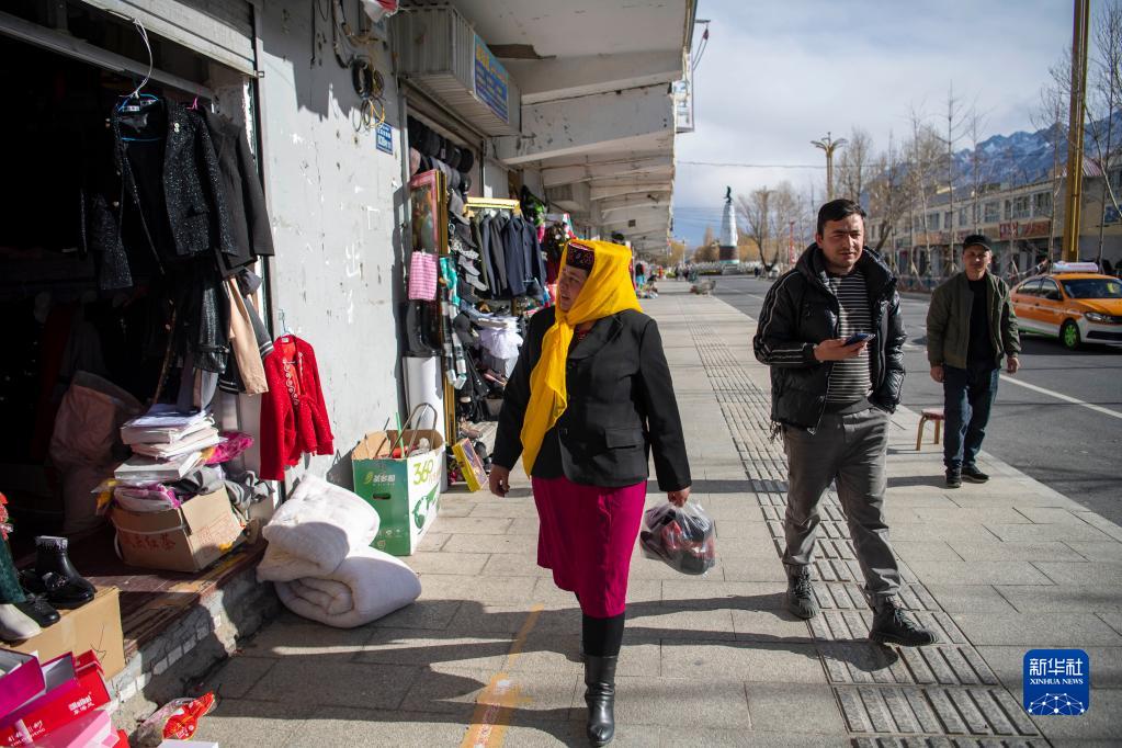 在县城的一条商业街,努尔卡热木·都热(中)和母亲那尼克·苦卡尼(左)逛街购买节日所需用品(2023年3月19日摄)。搬迁前,因交通不便,那尼克极少来县城,从没有去过喀什市城区。