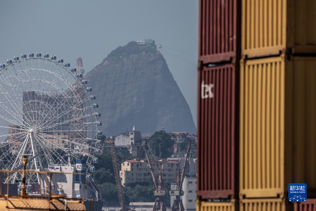 这是3月20日在巴西里约热内卢港一处集装箱码头拍摄的远处的“里约之星”摩天轮和“面包山”。