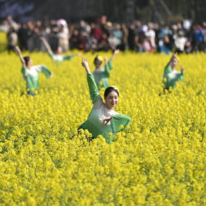 3月26日,演员在梅蓉村的油菜花田里表演。
