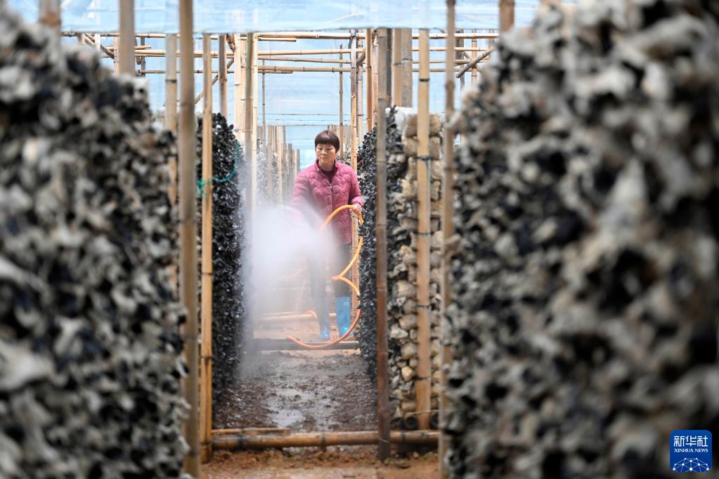 3月27日,在柳州市柳城县社冲乡柳州螺蛳粉原材料基地里,农民在木耳基地大棚里浇水。