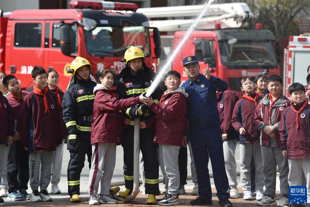 3月27日,在江苏省宿迁市苏州外国语学校,学生在消防员的指导下体验消防水枪。