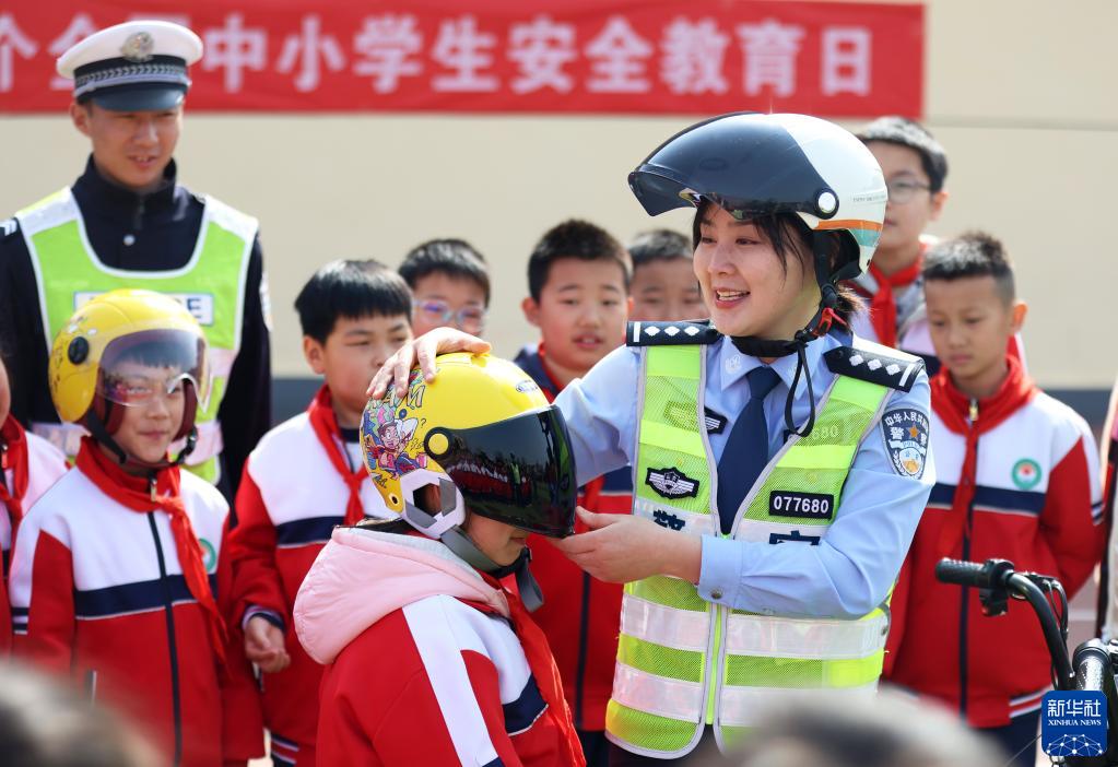3月27日,在山东省郯城县东方红小学,民警在为小学生讲解佩戴头盔的重要性。