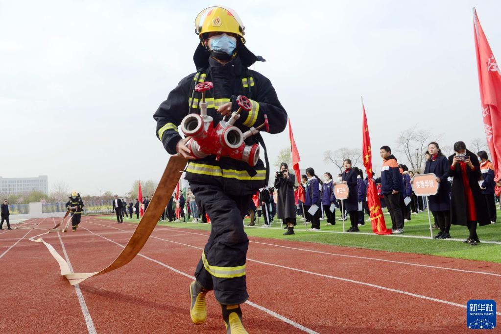 3月27日,在河南省驻马店市汝南县第三小学,消防员进行消防实操演示。