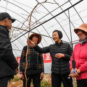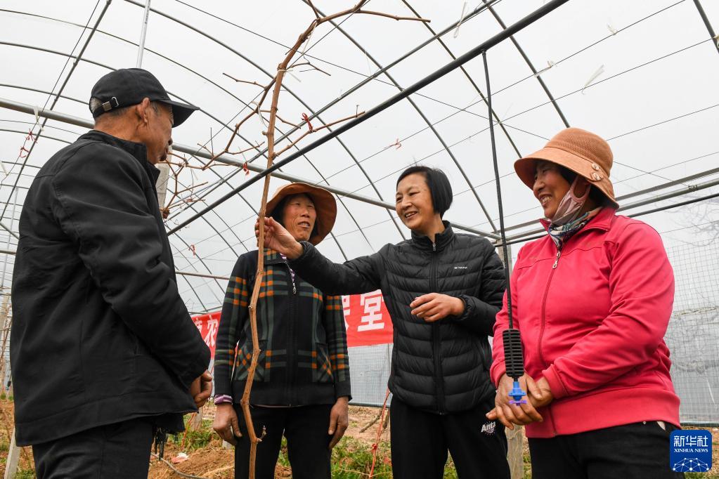 3月27日,沂源县农业技术服务中心果业科科长徐志芳(右二)在张家坡镇王庄村葡萄大棚内为果农讲解管护技术。