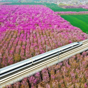 3月27日,高铁列车从许昌市建安区小召乡紫荆花海中驶过(无人机照片)。