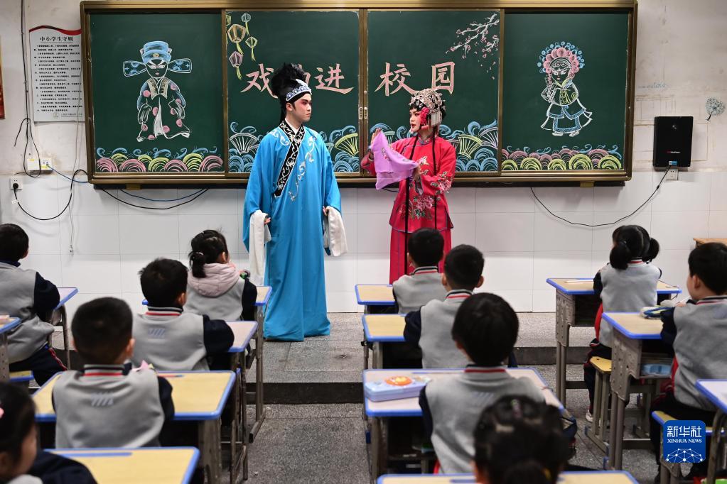 当日是世界戏剧日,江西省宜春市万载县花灯戏剧团演员来到当地第二小学,为学生们讲解和表演花灯戏,让孩子们近距离感受传统戏剧文化的魅力。
