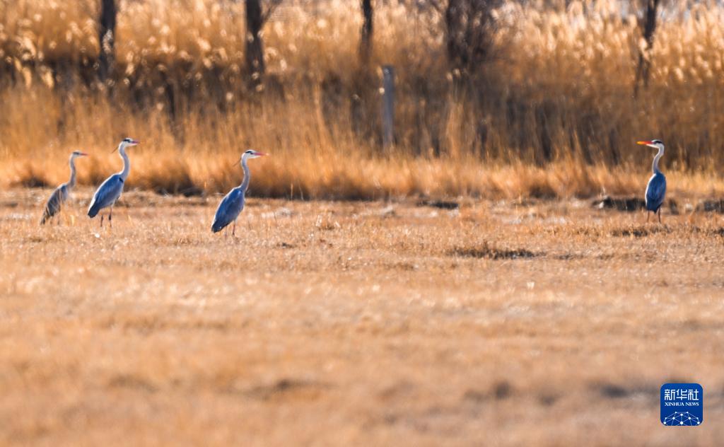 3月27日,苍鹭在孟家段国家湿地公园觅食。