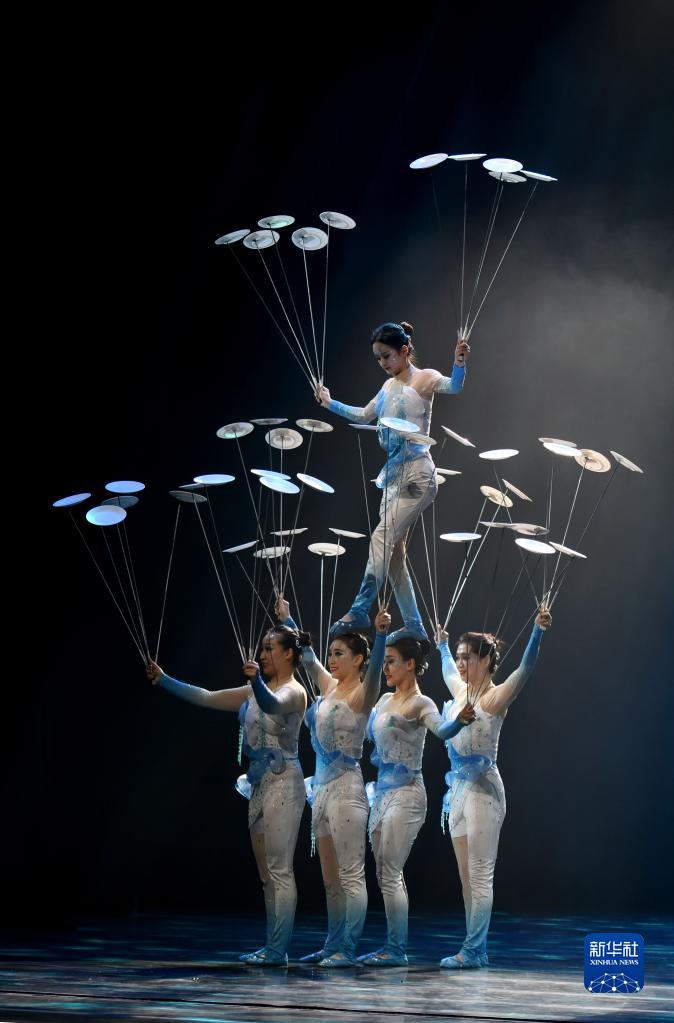 3月27日晚,在位于山东省济南市的山东剧院,演员表演杂技节目《集体花盘》。