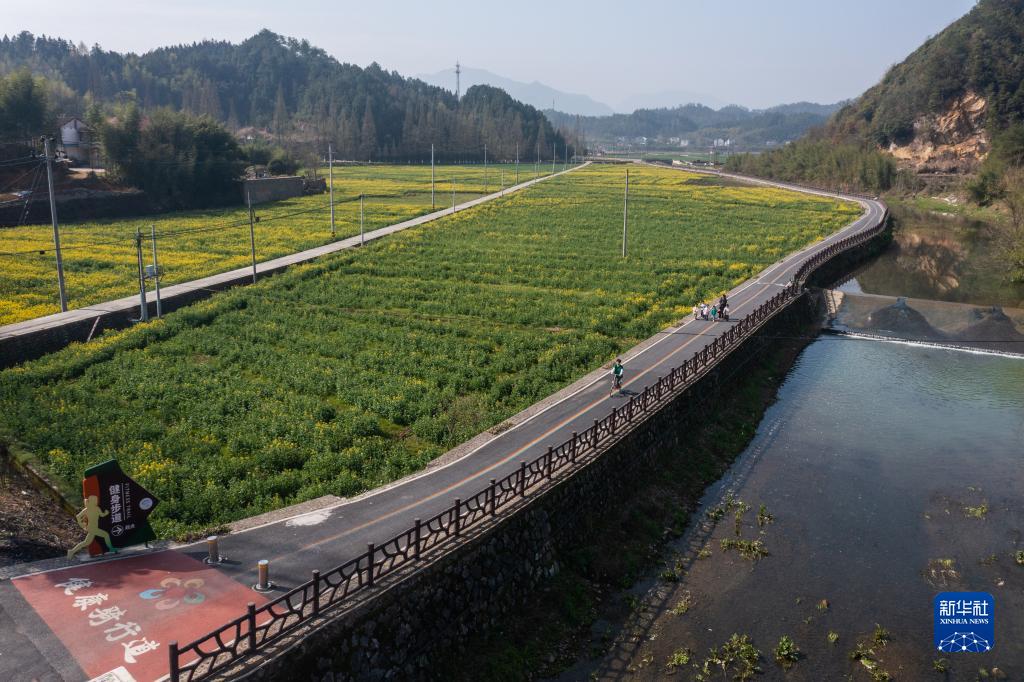 3月28日,这是杭州市临安区太阳镇以稻香和水杉为主题的健康骑行道,总长度11.7公里(无人机照片)。