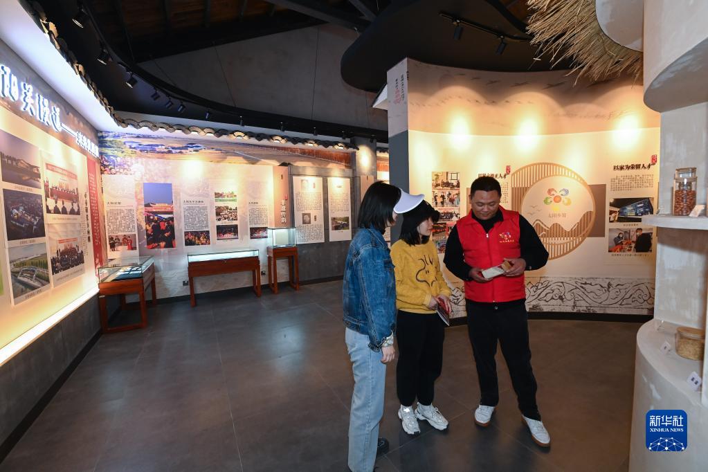 3月28日,在杭州市临安区太阳镇的小镇会客厅,党员志愿者在为游客介绍当地的粮仓文化。