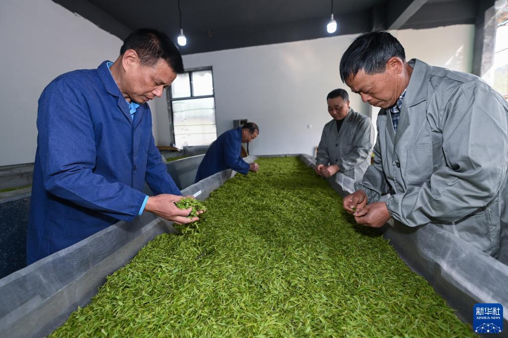 3月28日,大岕口村乡贤吴建良(左一)在茶叶合作社内指导低收入农户分拣茶叶鲜叶。