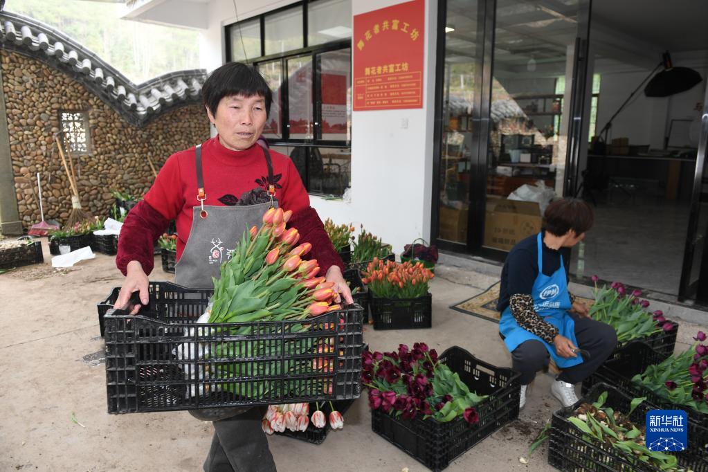 3月28日,经营花海的浙江舞花者园艺有限公司工作人员在制作鲜切花产品。