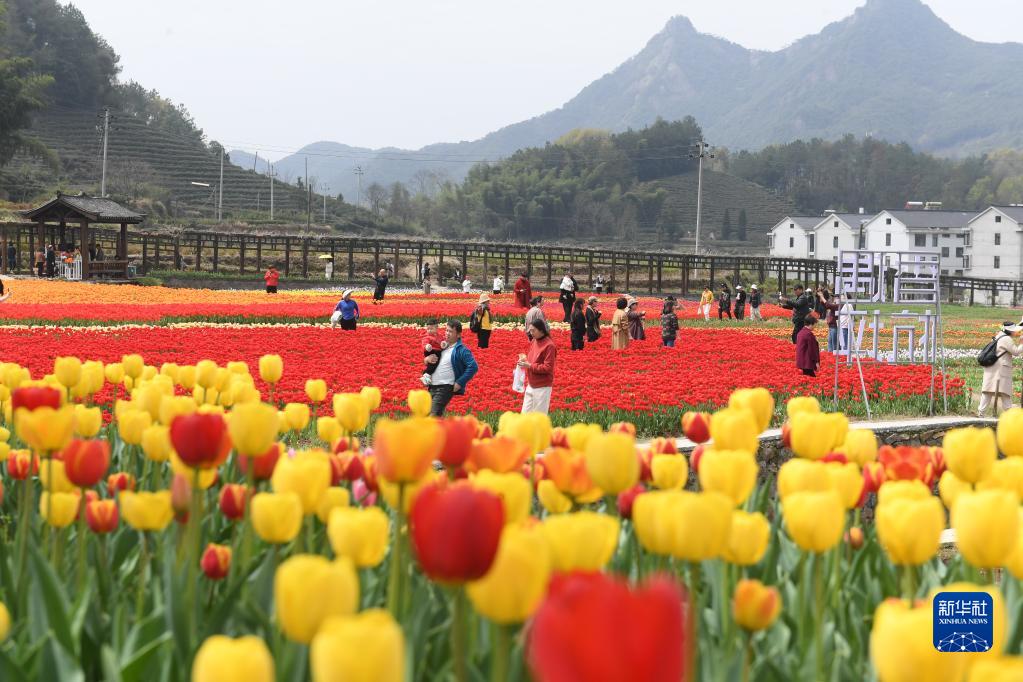近日,浙江省金华市浦江县杭坪镇乌浆村100亩郁金香盛开,吸引不少游客前来观赏。这片闲置土地由回乡创业的乡贤开发,打造成花海,免费向游客开放,这里还提供鲜切花订购服务,帮助周边农户增收。