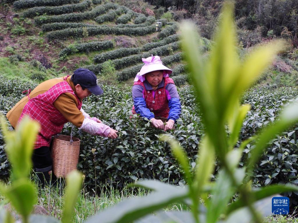 3月28日,四川省达州市大竹县团坝镇白茶村巴山青白茶种植基地,茶农在采摘明前茶。