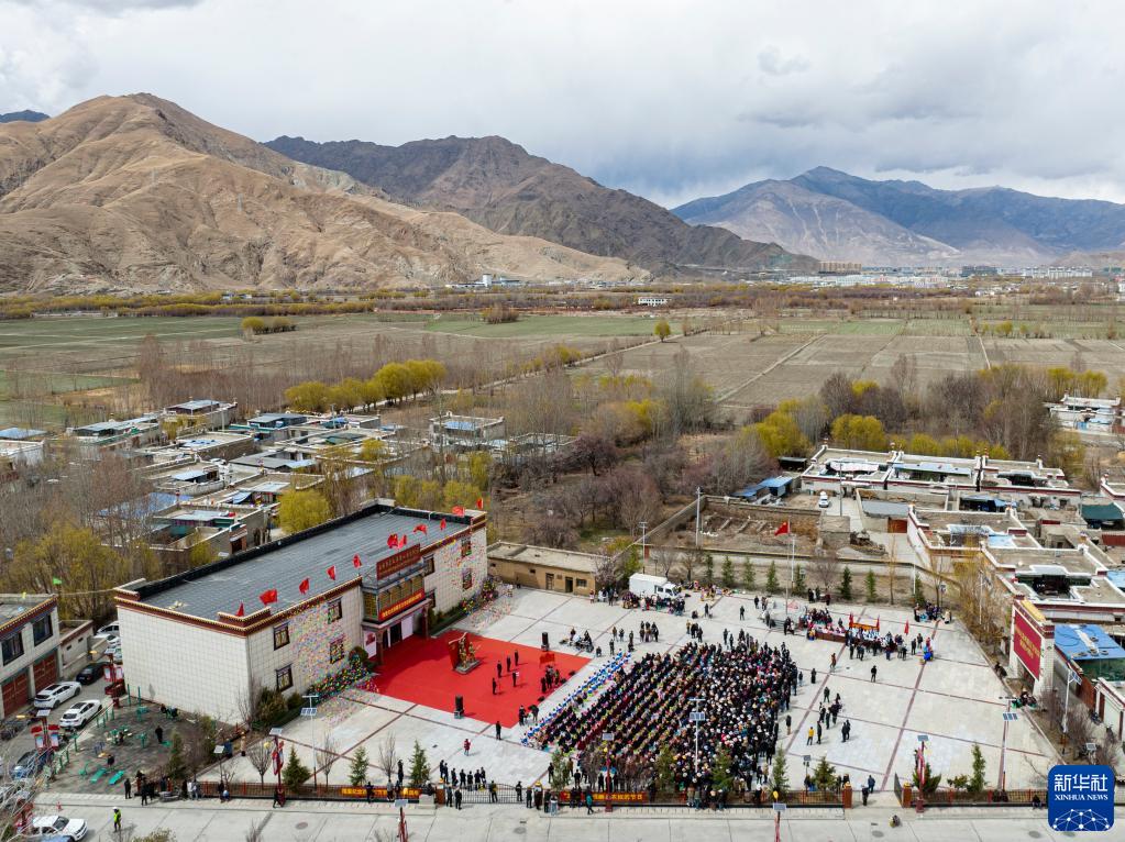 3月28日,在山南市乃东区,西藏民主改革第一村陈列馆重新开放,人们在陈列馆前举行仪式,纪念西藏百万农奴解放64周年(无人机照片)。