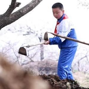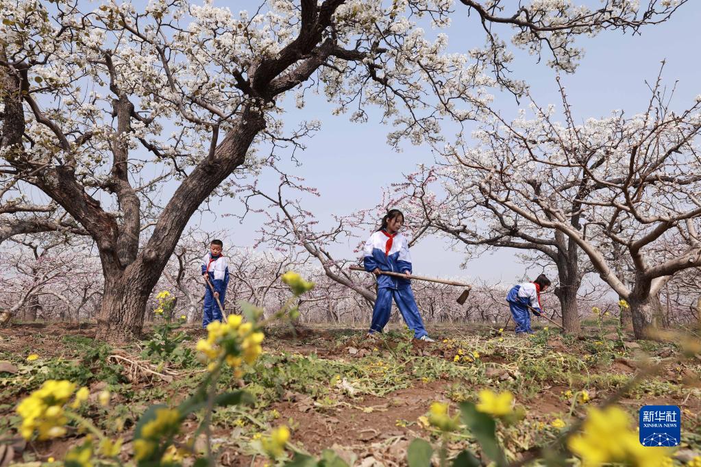 3月28日,内丘县大都城小学学生在梨园锄草。
