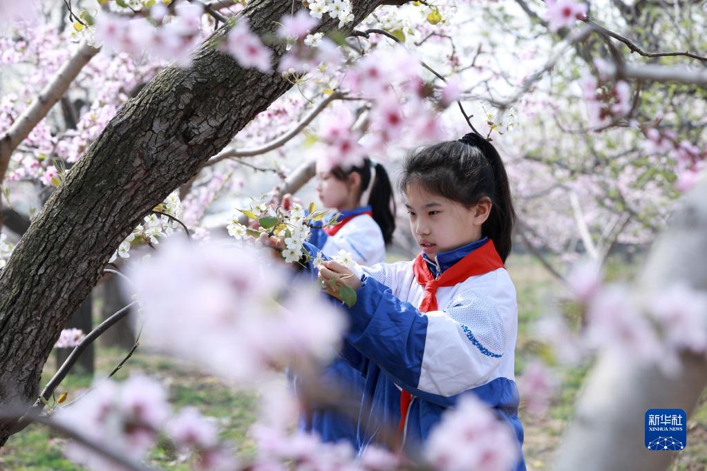 3月28日,内丘县大都城小学学生在梨园疏花。