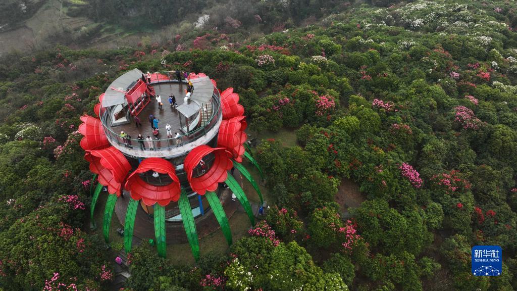 3月28日,游客在贵州省毕节市百里杜鹃风景区赏花(无人机照片)。