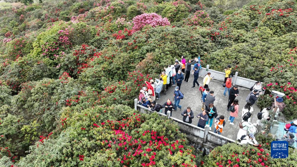 3月27日,游客在贵州省毕节市百里杜鹃管理区天然野生杜鹃林参观游览(无人机照片)。