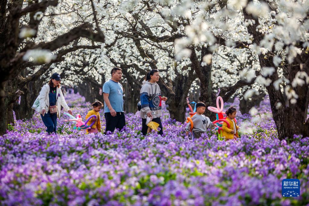 3月27日,游客在江苏省宿迁市三台山森林公园“梨兰会”景区内赏花游玩。